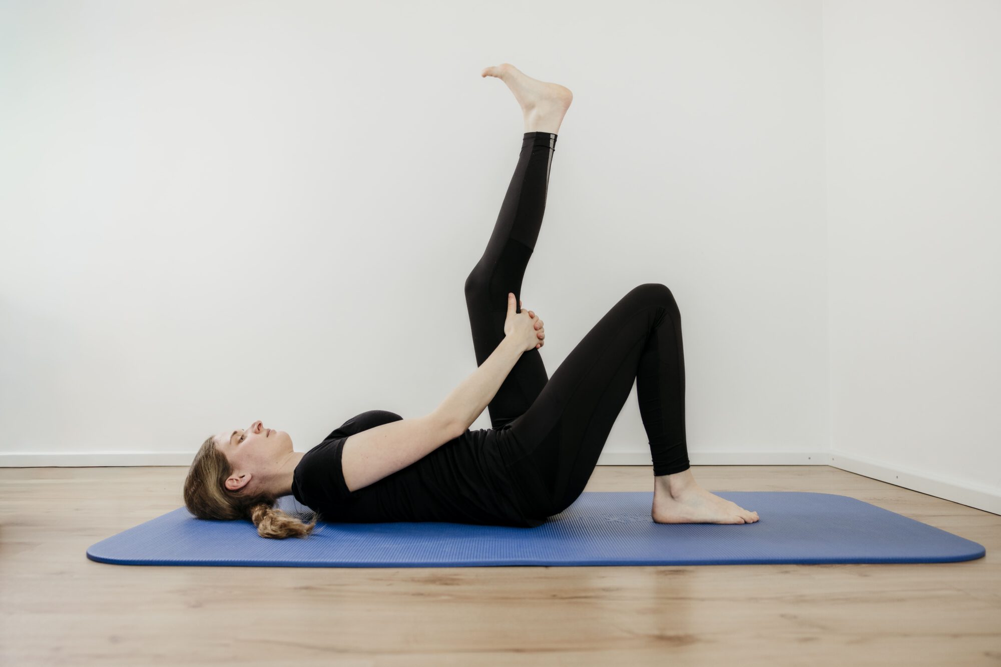 • das linke Bein so weit wie möglich in Streckposition mit beiden Händen am Oberschenkel greifend in Richtung Brust anziehen