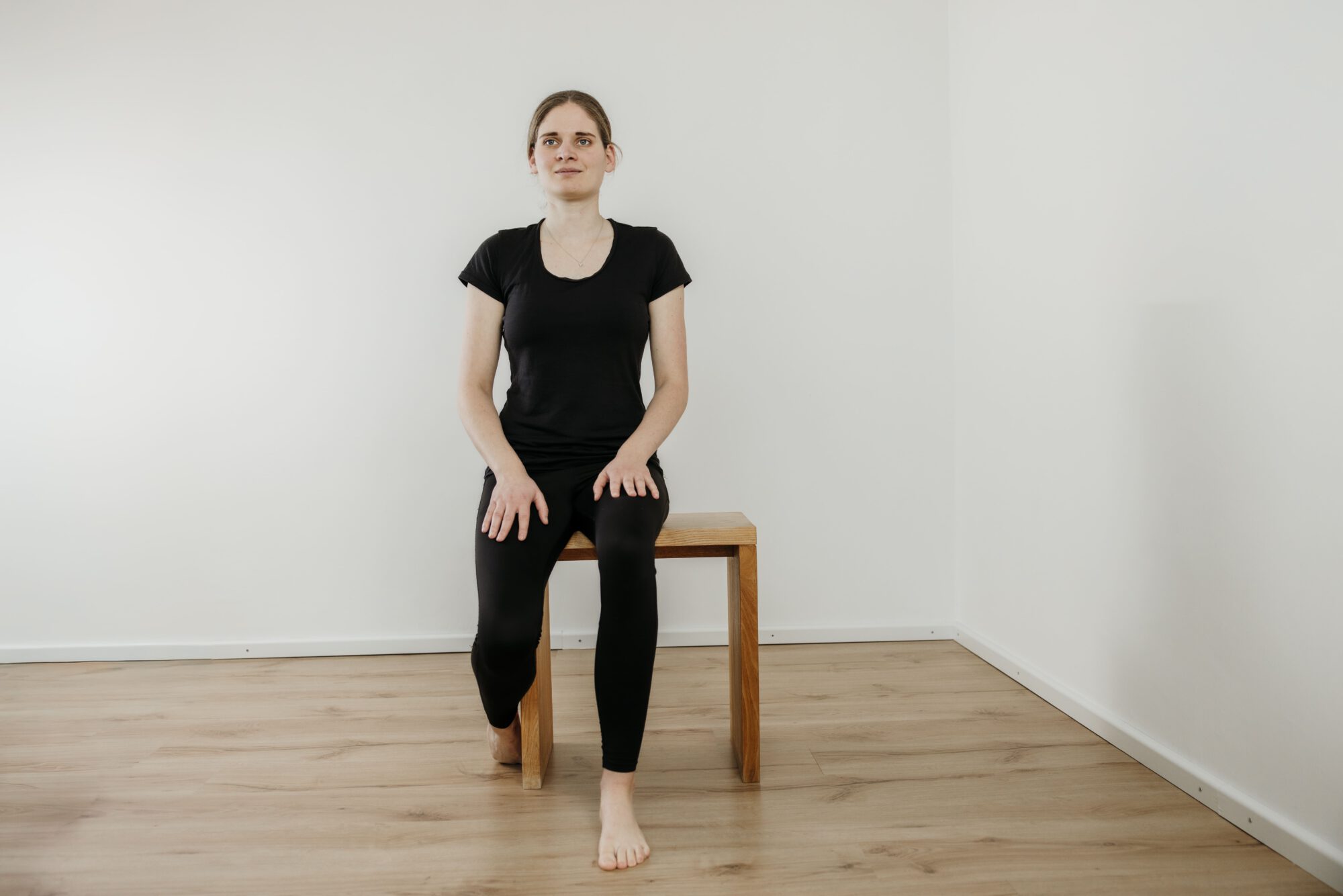 • auf einem Stuhl oder Hocker sitzend